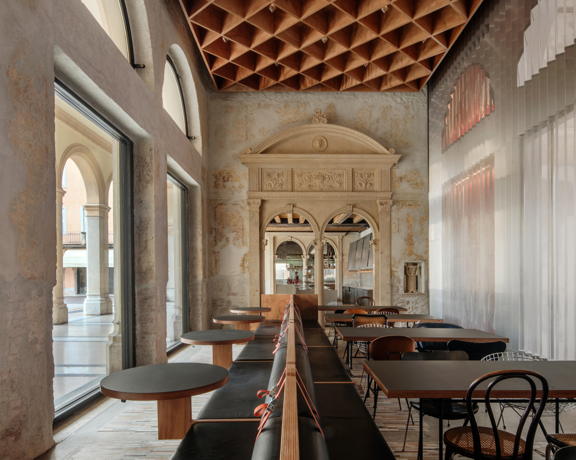 previous3/12next | The Caffè Nazionale, designed by AMAA, embraces the city: the restoration of this historic venue in Arzignano, Northern Italy, is a multifaceted project that draws upon existing elements and memories to create a vibrant, living palimpsest. AMAA designed the Caffè Nazionale by establishing a direct relationship with the city of Arzignano, Italy, and its public spaces. The historical traces, with which the project engages in a deeply creative dialogue, generate a layered depth that AMAA has emphasized through a series of spatial elements acting as theatrical backdrops. The studio, founded by Marcello Galiotto and Alessandra Rampazzo, envisioned an intense, collaborative intervention, with artist partnerships culminating in an open and multifaceted creation.